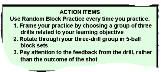 Vill du utvecklas snabbare, säger inlärningens forskning, att du ska tillämpa vad man på engelska kallar: Random Block Practice. Att träna mera verklighetstroget som vi spelar.